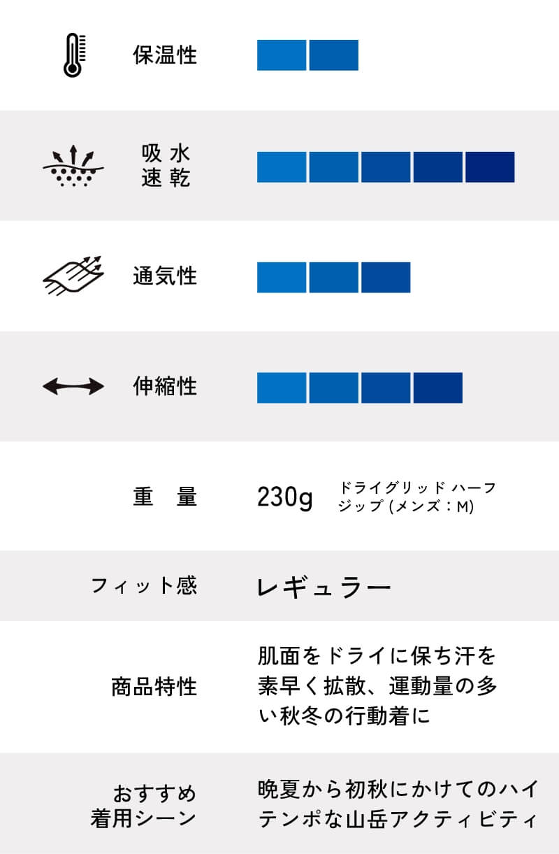 肌面は水を含まないポリプロピレン素材のグリッド構造、表面には速乾性に優れたポリエステルを組み合わせた、独自のハイブリッド・グリッド構造で、発汗量の多いアクティビティで常に肌面をドライに保ちつつ、非常に高い吸汗速乾性を実現。換気性を高める長めのフロントハーフジップは、晩夏から初秋にかけての山岳アクティビティ全般における最適解です。