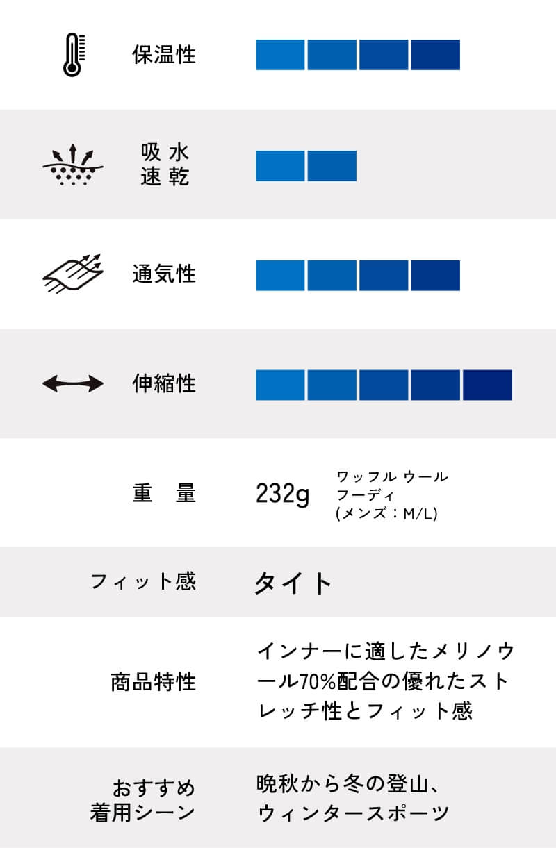 天然の快適性を備えた高品質メリノウールと、耐久性や速乾性に優れた化繊との混紡素材によるワッフル生地を、計算されたコンピューター編みで仕上げることによって、絶妙なフィット感と保温性、通気性をバランスよく実現しました。脇下や背中など部位によって編み方を粗くするなどの調整を加えることで通気性や伸縮性を絶妙にコントロール。バラクラバにもなるフーディタイプは低温下でのベースレイヤーとしても重宝します。