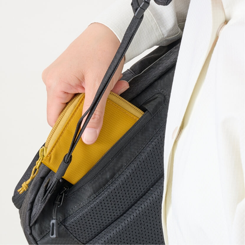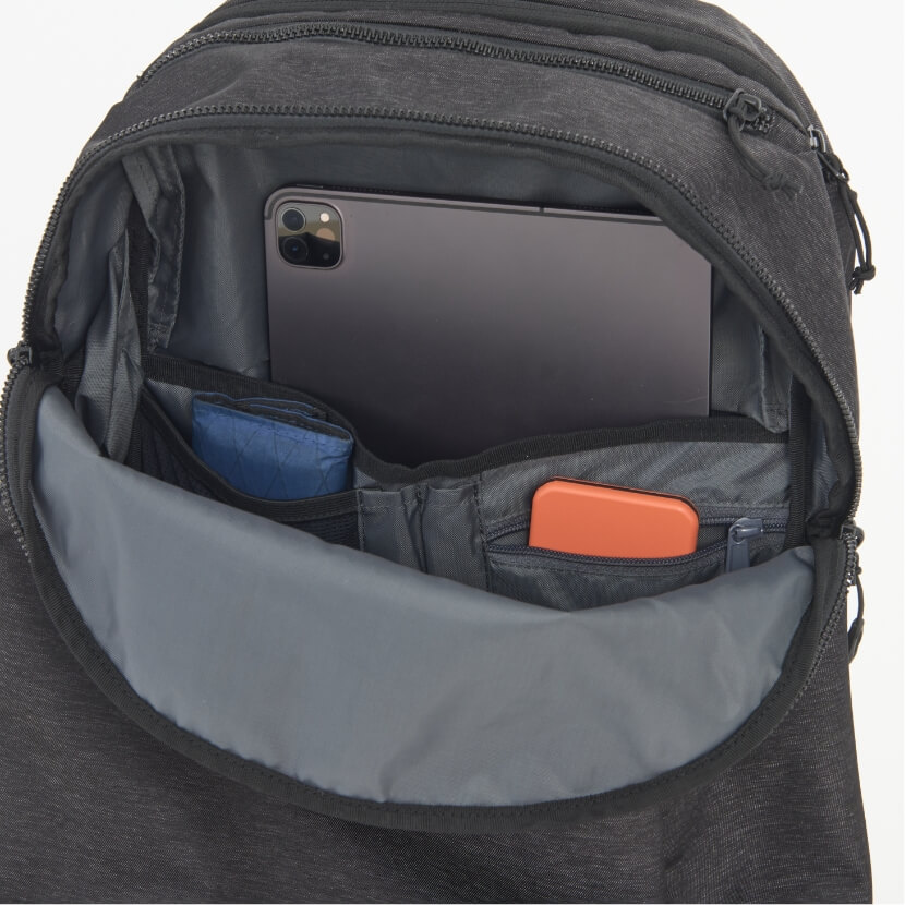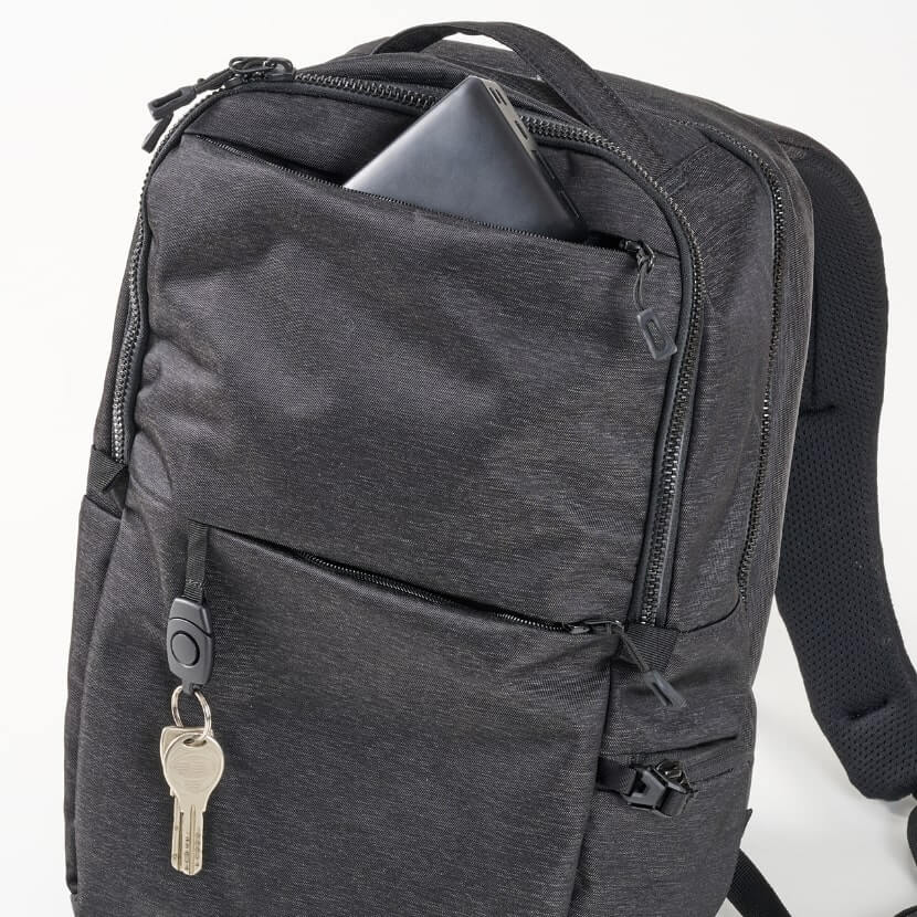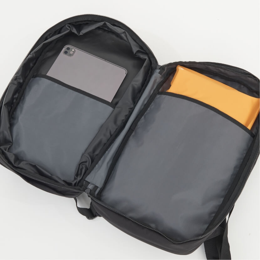 コンパクトなデザインながら、スマートな収納力を誇る都市型バックパック。フロントには2つのジップポケットを、サイドにはランチボックスも収納可能なU字型ジップポケットを配置。さらに、背面には背負ったままアクセスできるセキュリティポケットを搭載。日常で必要なアイテムをすっきり整理できる機能的なデザインです。