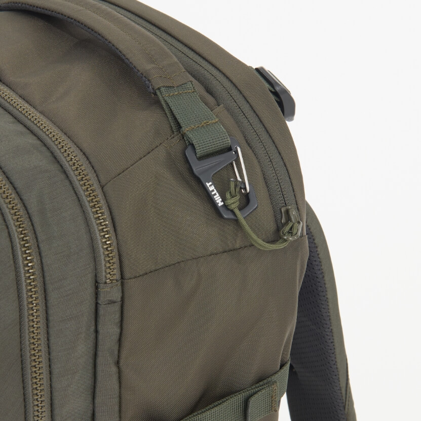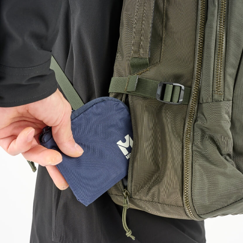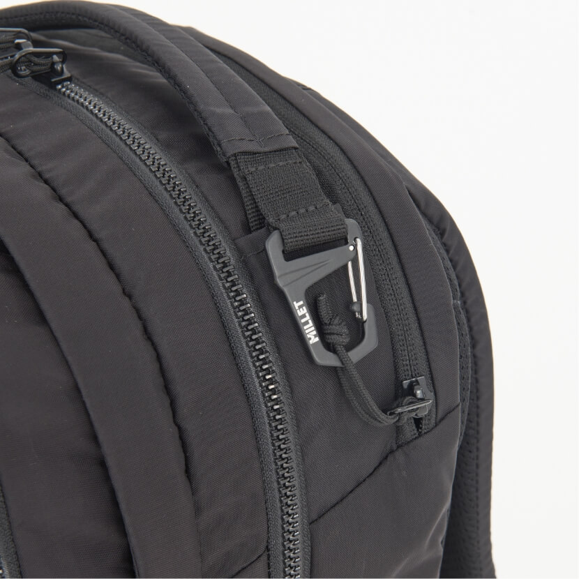簡易的にメイン収納の開閉をロックするMILLET ロゴ入りカラビナ付き。