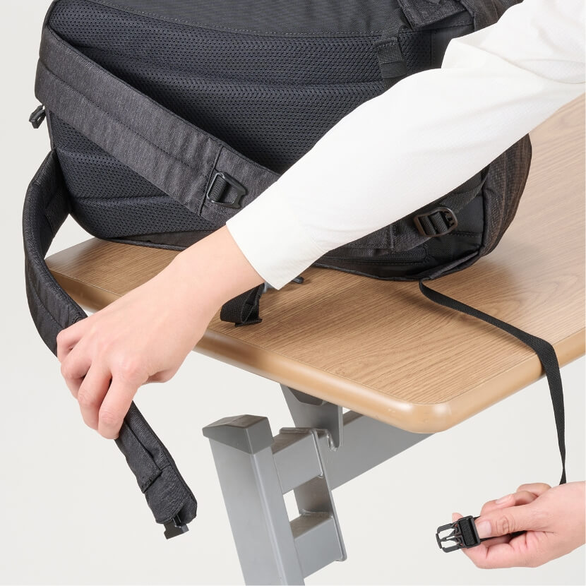 椅子や柱などに固定するために、バックルで取り外しができる右ショルダーハーネス。