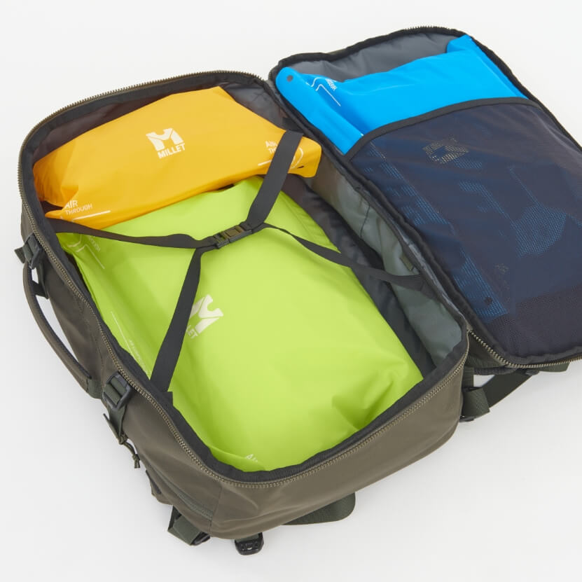 全体が大きく開口し、着替えなどの収納力に優れたメインコンパートメント。