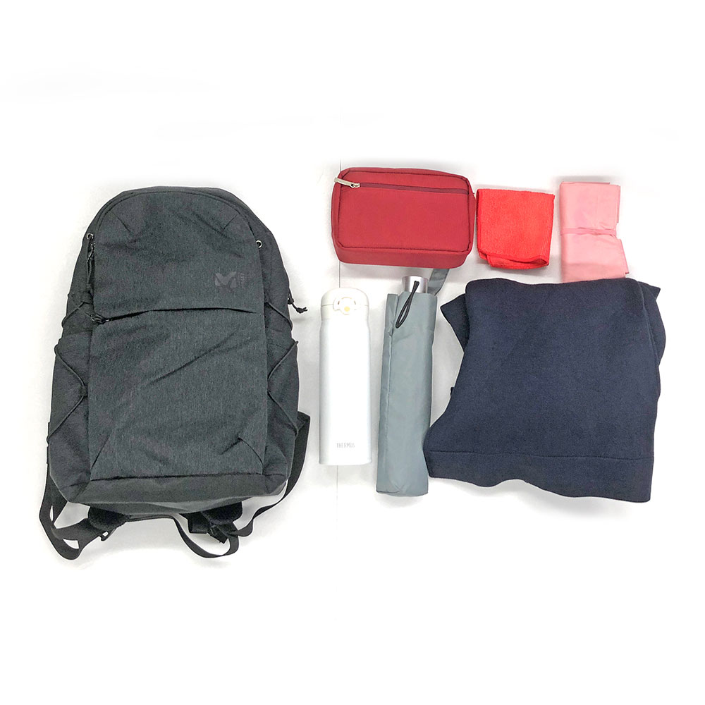 上着やポーチ、水筒、傘など、これだけ入れてもまだ余裕のあるサイズです。