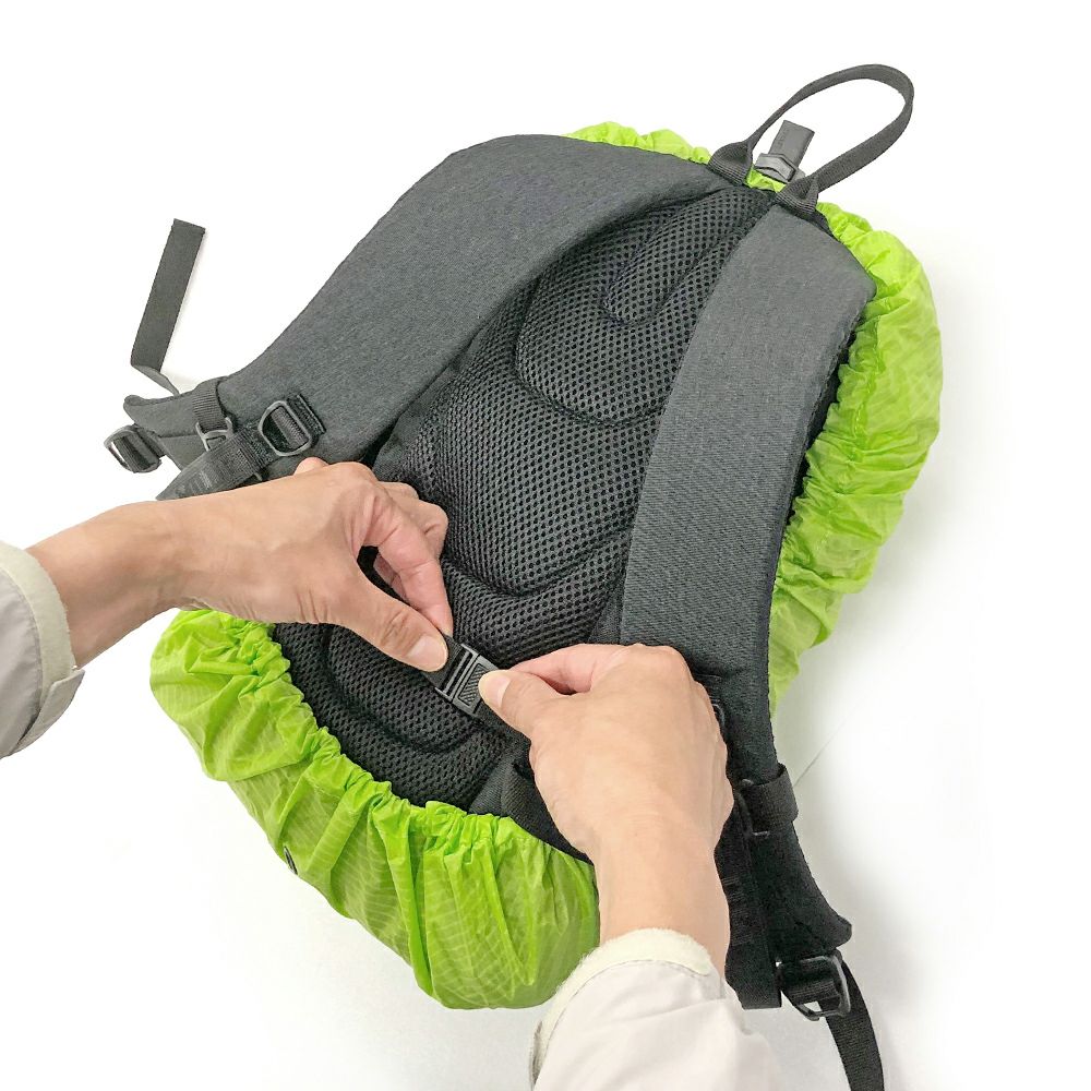 ザックの背中側にぐるっと留めるストラップ付き。気づかないうちに外れてしまうこともありません。