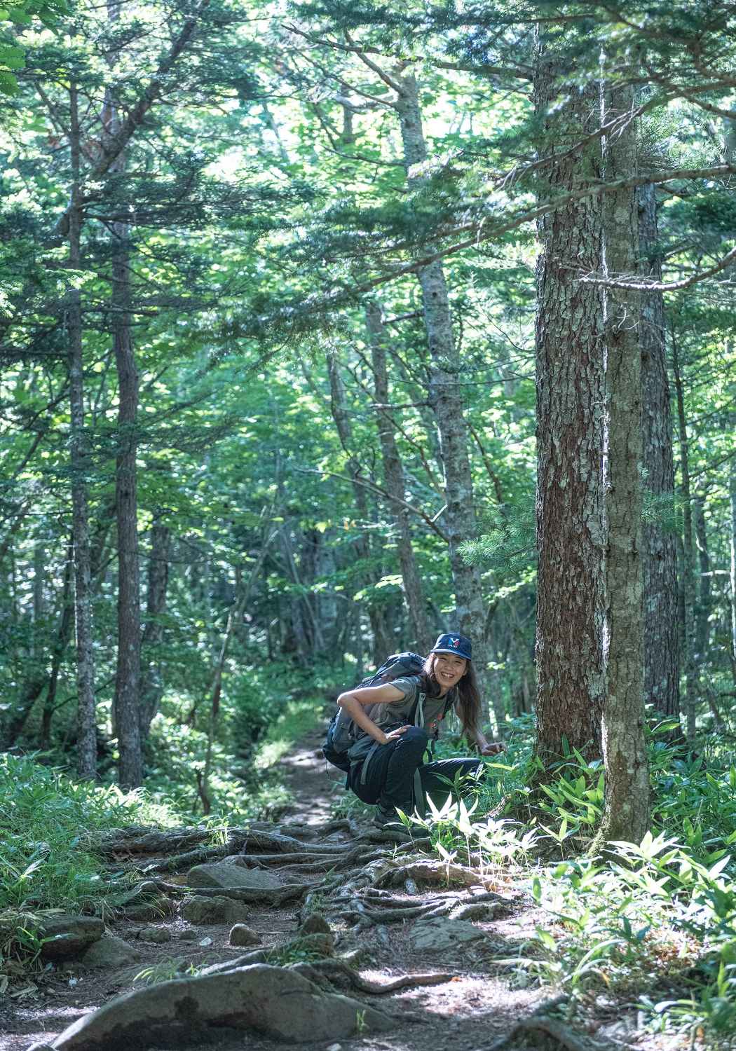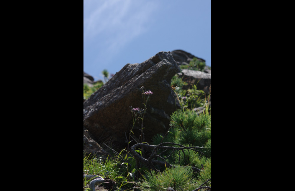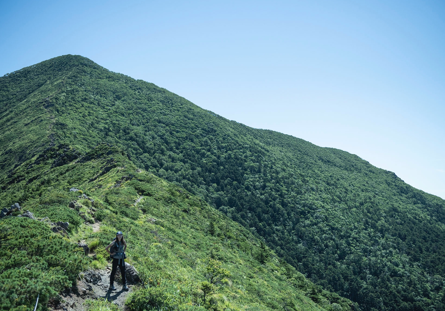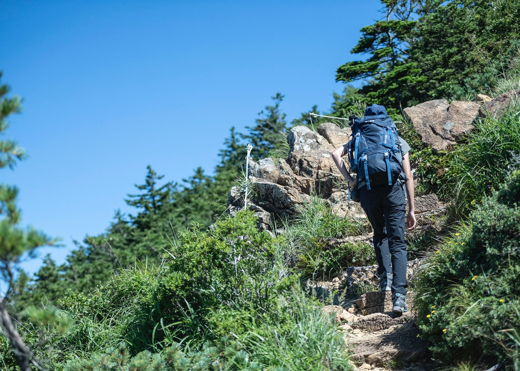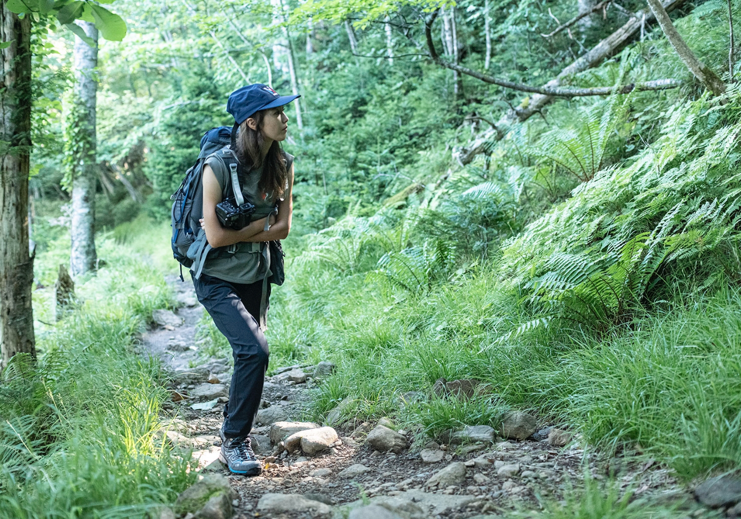 KUSACOさんは岩の目立つ登山道をスイスイと歩き進む。真夏の太陽はくっきりと影を落としてあらゆるもののエッジを際立たせ、山の木々の葉っぱの一枚一枚が見えるほどにコントラストを高めている。高緯度地方独特の、カリカリにシャープな夏空が広がっていく。