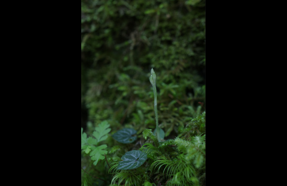 見つけたのはミヤマウズラだったが、彼女が一生懸命写真を撮っているのは草丈4cmほどの茎だ。薄緑色の茎に華やかさはなく、素人目に嬉々として写真を撮るようなものには見えない。が、彼女にとってこれは宝石なのだ。