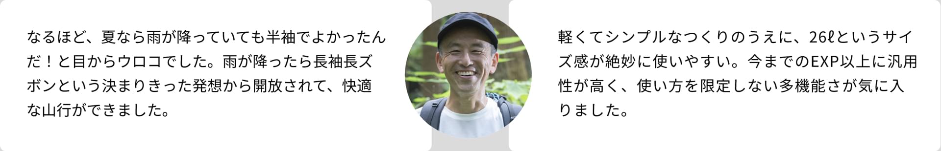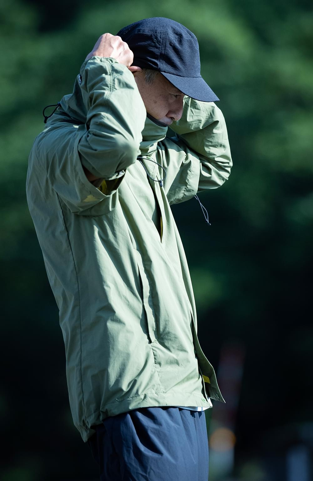 濡れに強いウインドシェルを、シャツ・フード・アームカバーに分割。気温や天候といった気象条件のほか、行動様式に合わせてその場その場でカスタマイズできる柔軟性の高さが魅力。