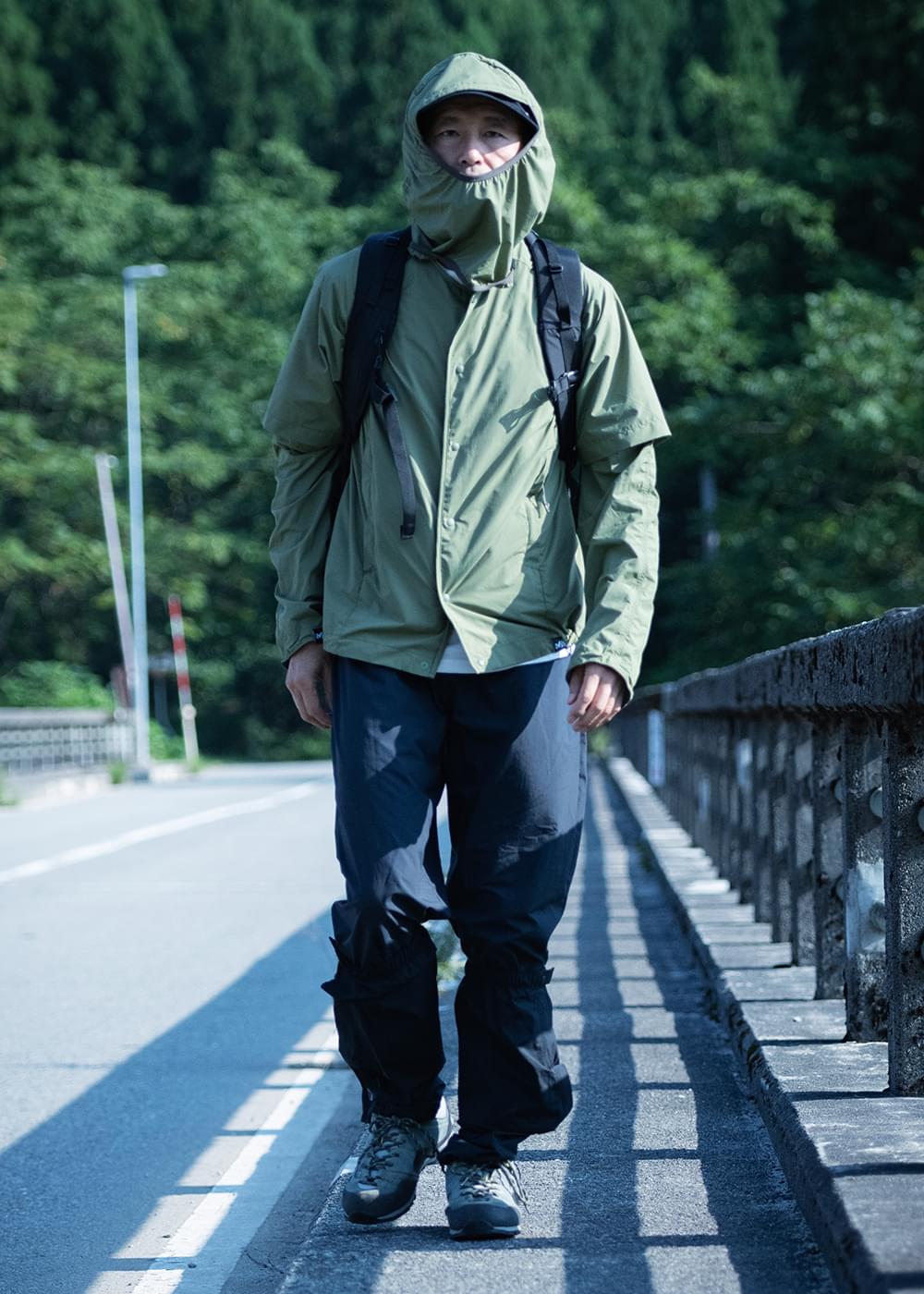 「やはり地元の人に会う、たとえばおじいさんの古い記憶を聞かせてもらうようなことが多いんです。その話の勢いで、今から行くぞっていう先が川だったり、山だったり、おじいさんの話の先にいろんな環境が待っている。となると、汚れや水濡れが気にならないタフさが大事になります。けれど大げさな格好になると向こうも構えちゃうし、行く先が町の図書館ってこともあります。そうなると町にとけこめる、比較的おだやかなデザインのほうが使いやすかったりします。となると、さりげないけど機能はじゅうぶん、という服装が理想かもしれないですね」