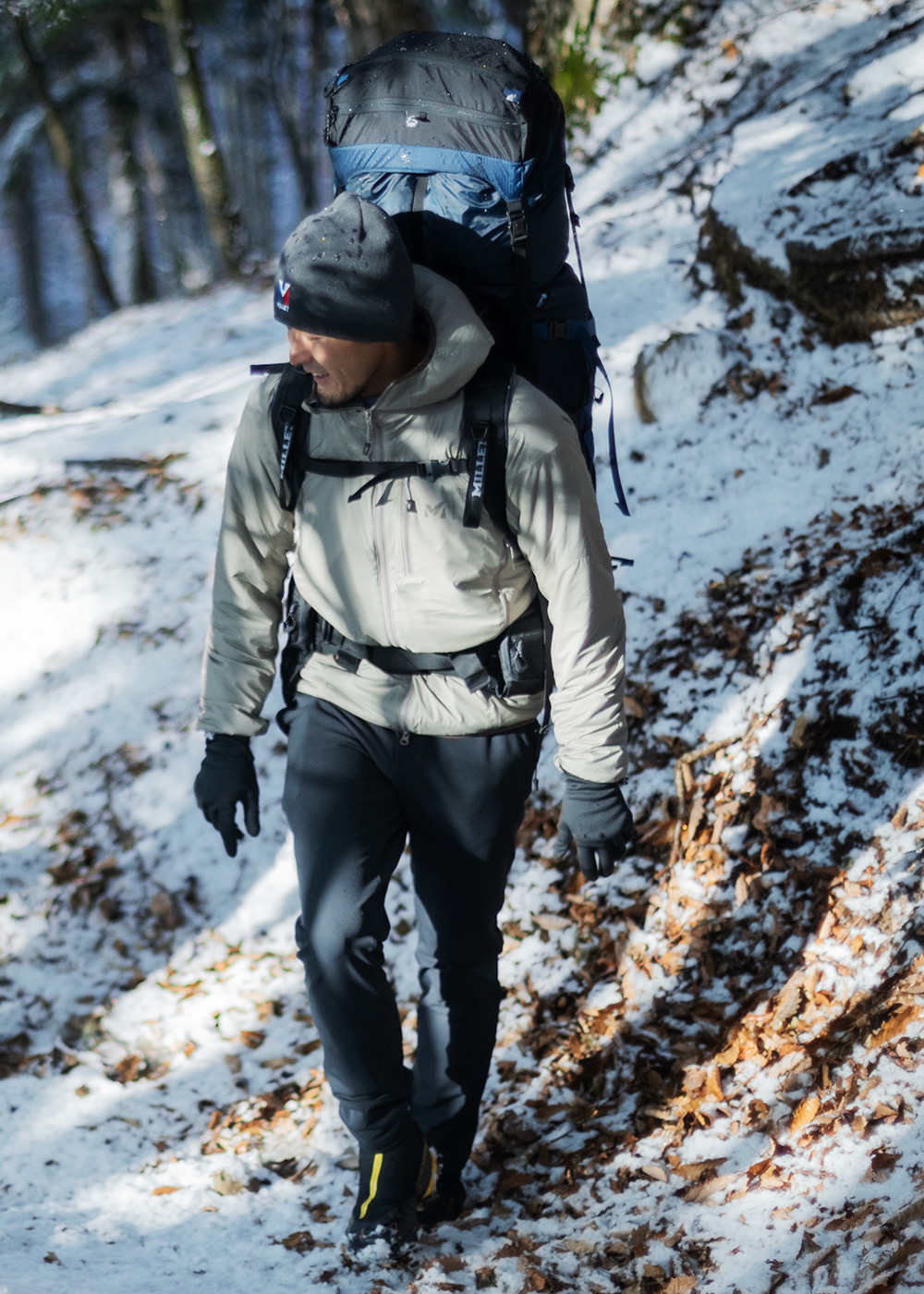 行動中は汗をかかない程度の保温性を保つよう、重ね着で対応します。夜は寒くなるので、防寒性を重視したウェアも持参しています。