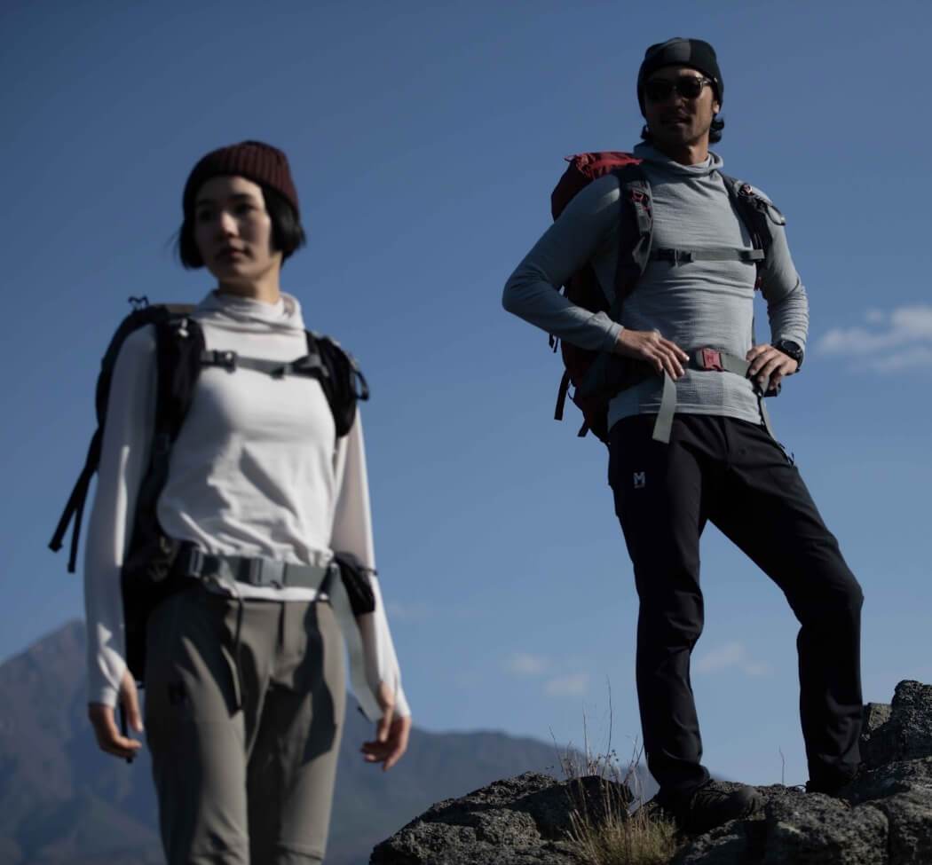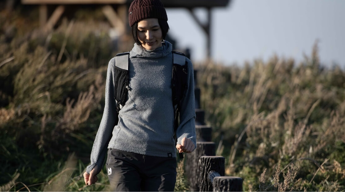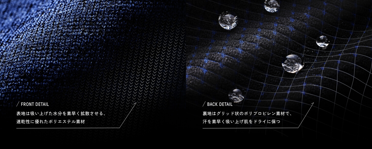 肌面は水を含まないポリプロピレン素材のグリッド構造、表面には速乾性に優れたポリエステルを組み合わせた、独自のハイブリッド・グリッド構造で、発汗量の多いアクティビティで常に肌面をドライに保ちつつ、非常に高い吸汗速乾性を実現。換気性を高める長めのフロントハーフジップは、晩夏から初秋にかけての山岳アクティビティ全般における最適解です。