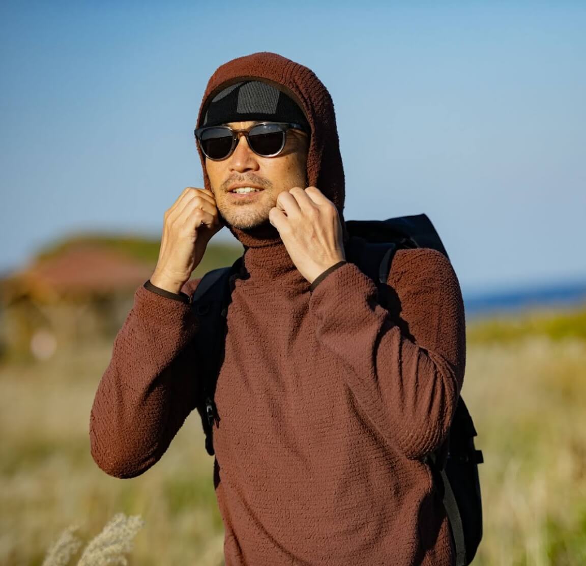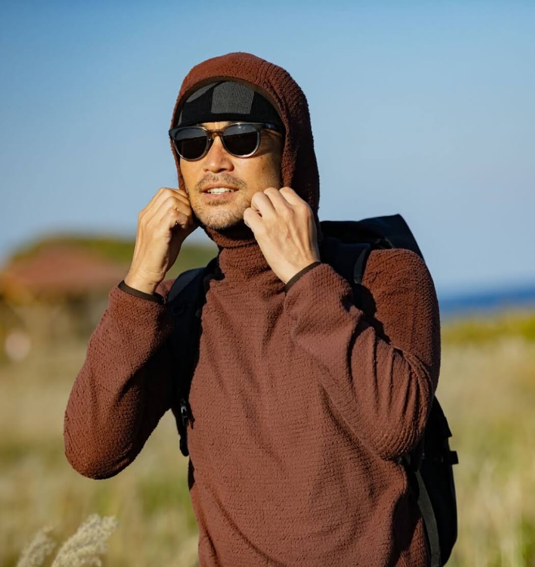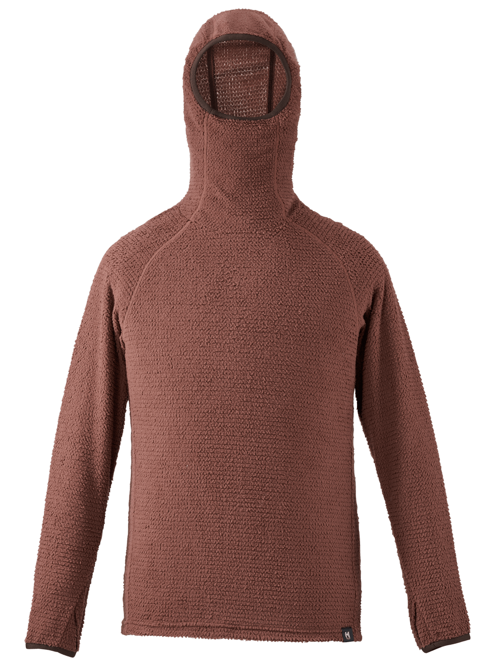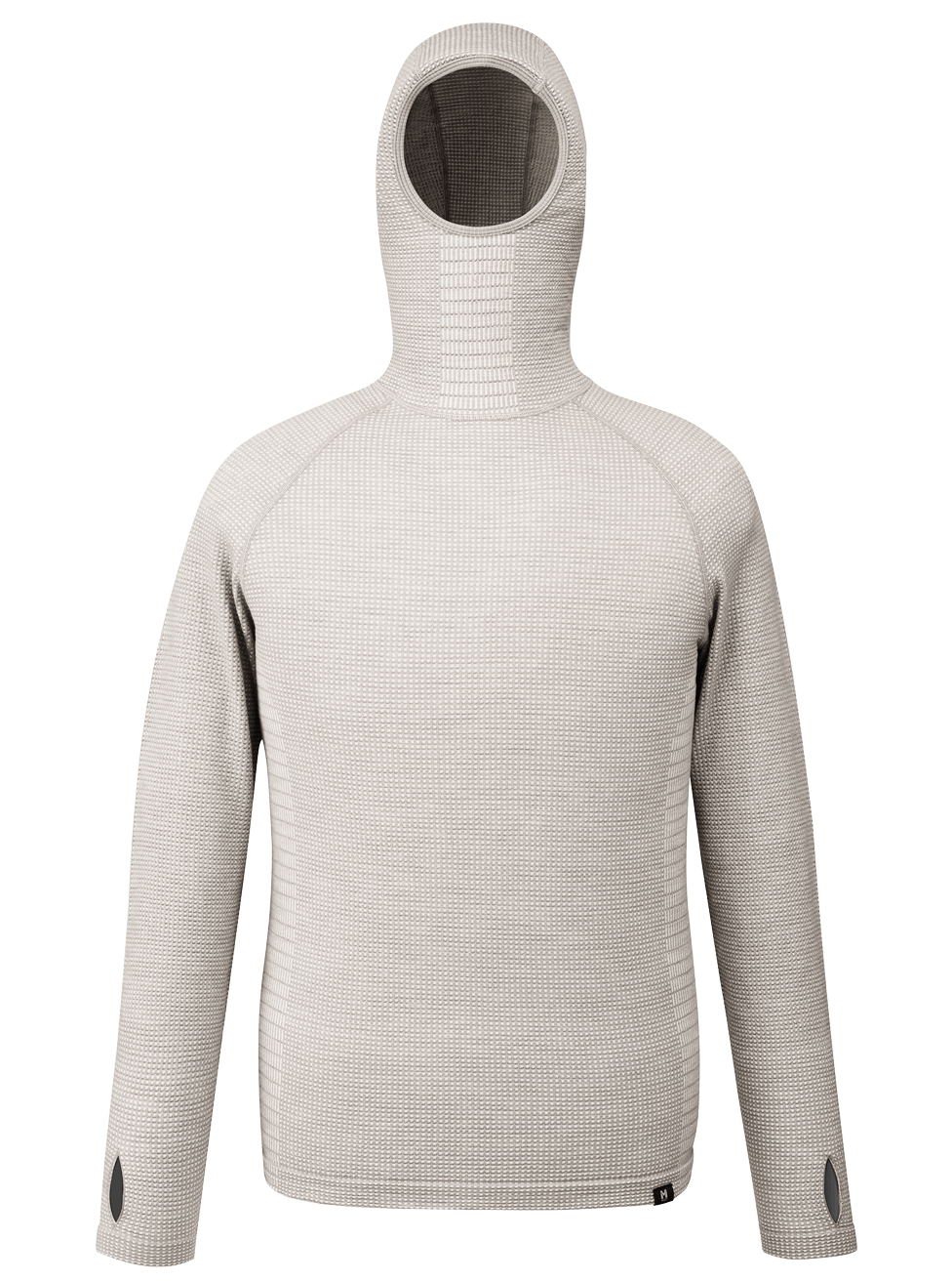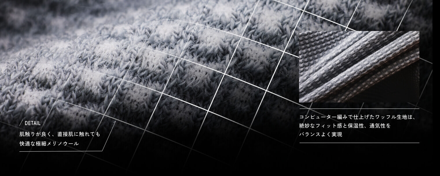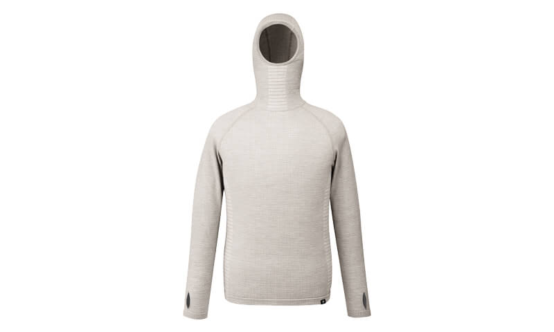 天然の快適性を備えた高品質メリノウールと、耐久性や速乾性に優れた化繊との混紡素材によるワッフル生地を、計算されたコンピューター編みで仕上げることによって、絶妙なフィット感と保温性、通気性をバランスよく実現しました。脇下や背中など部位によって編み方を粗くするなどの調整を加えることで通気性や伸縮性を絶妙にコントロール。バラクラバにもなるフーディタイプは低温下でのベースレイヤーとしても重宝します。