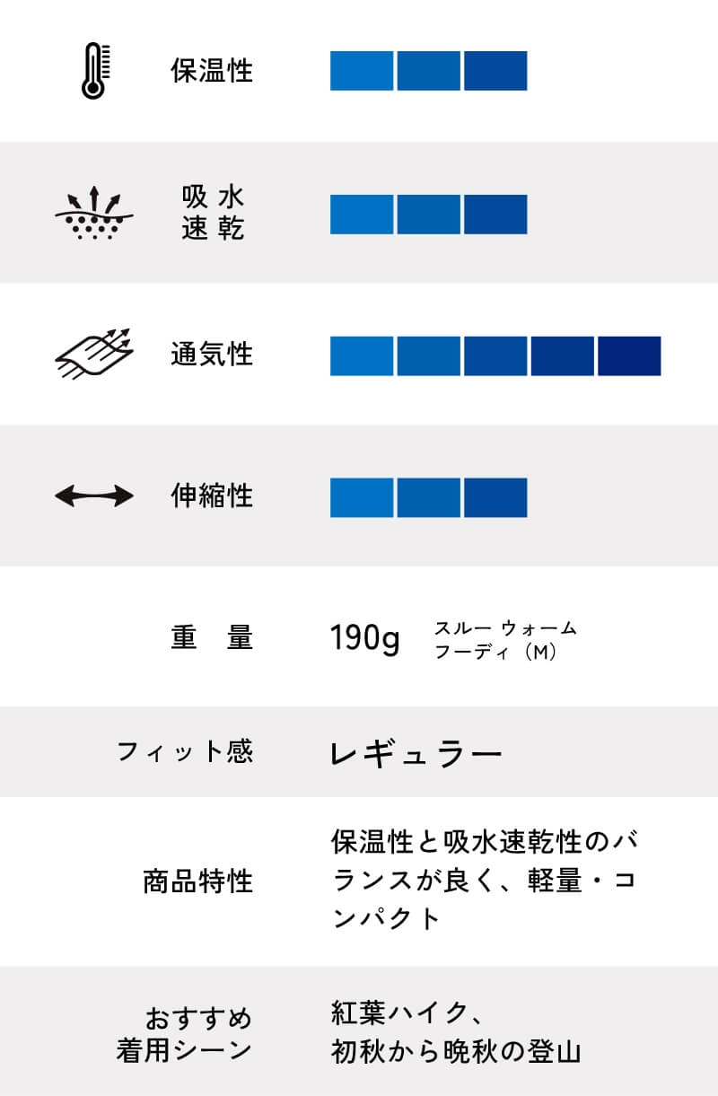 独自のメッシュ構造で編立した薄手の起毛素材「スルー ウォームⓇ」を採用したアクティブインシュレーションフーディ。保温性と通気性を兼ね備えながら、驚くほどの軽さを実現。冬のハイテンポなアクティビティでの保温行動着として、さまざまなシーンで活躍してくれます。携帯性にも優れ、いつでも持っていたい一着です。