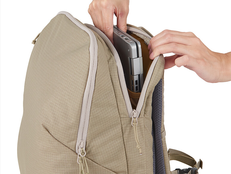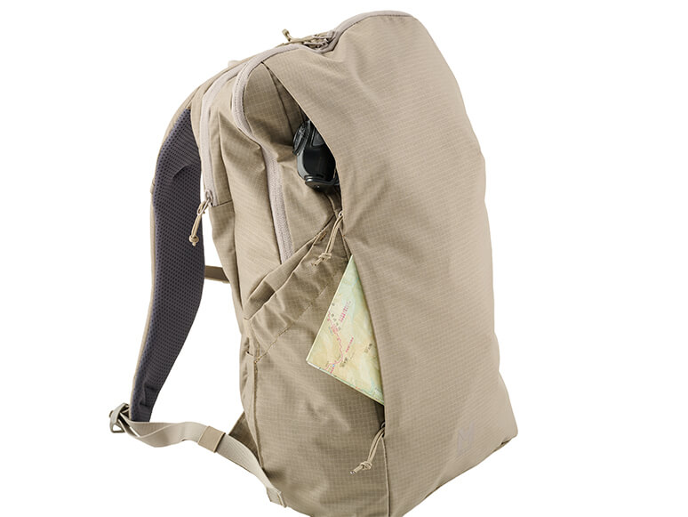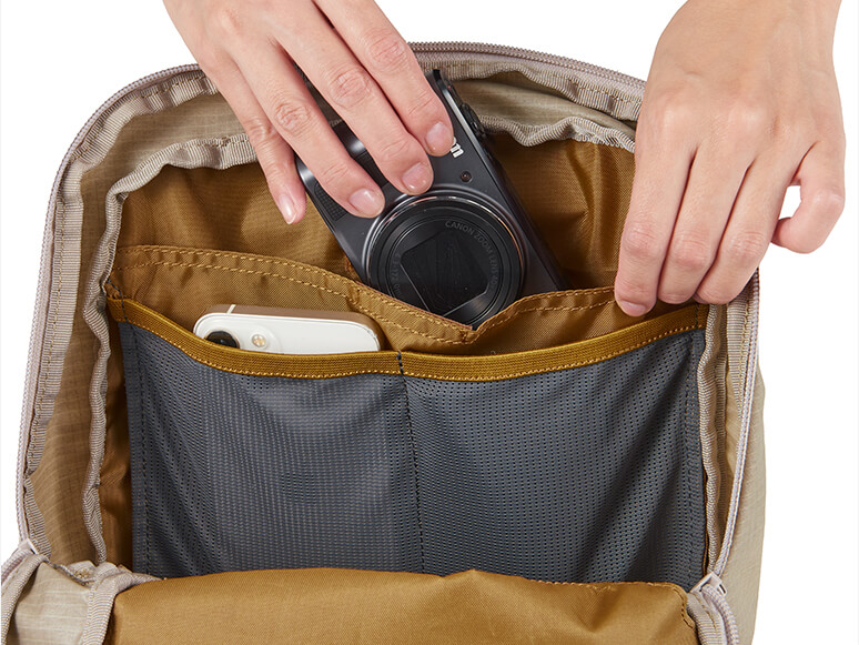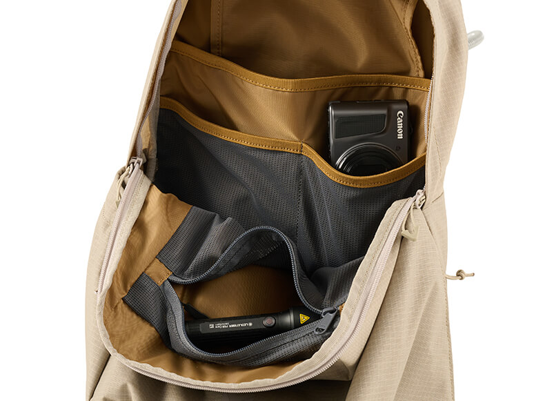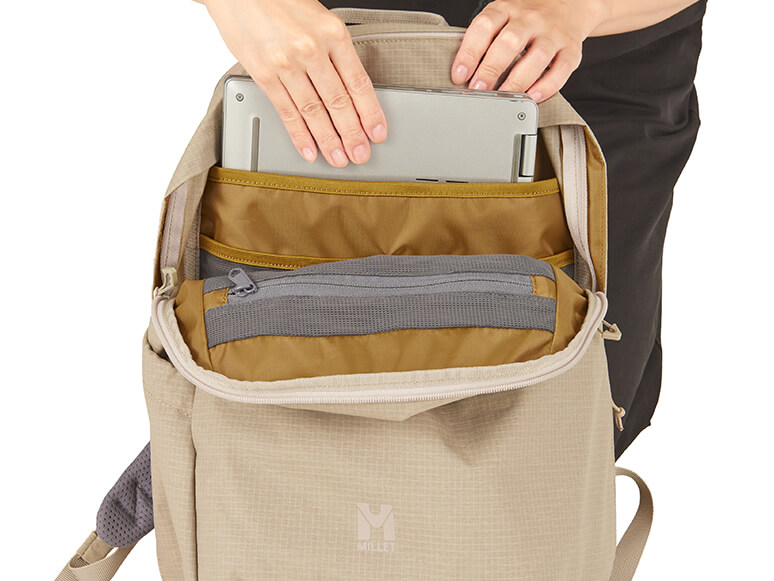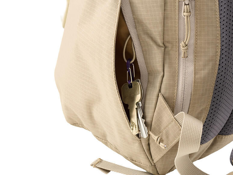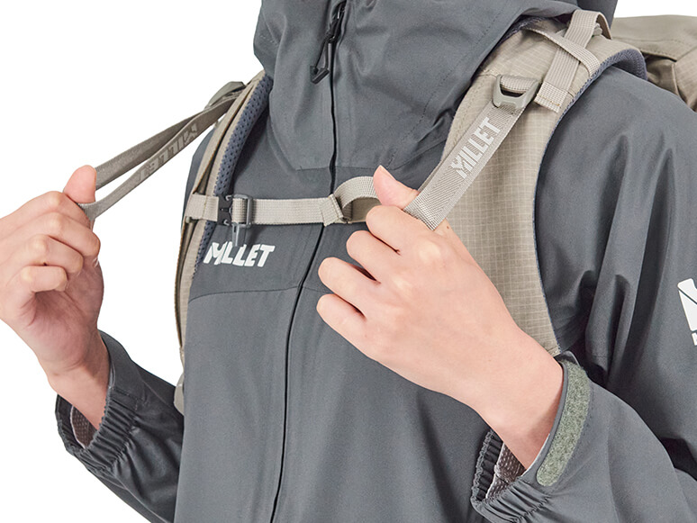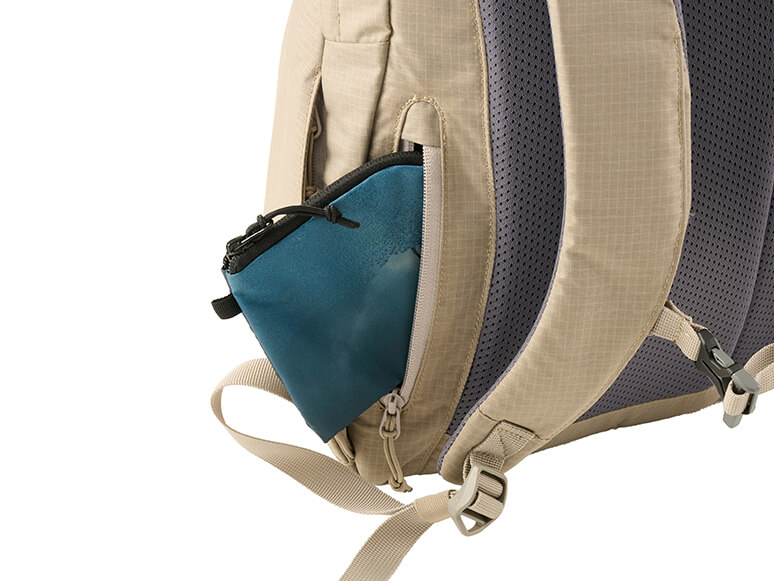 雨に強く、収納力に優れた雨蓋付きモデル。女性の体型に合わせた背面設計とショルダーカーブで快適なフィット感を実現。豊富なポケットやPCスリーブ、背負ったまま使える背面ポケットなど、フィールドでも日常でも使いやすい多機能設計。