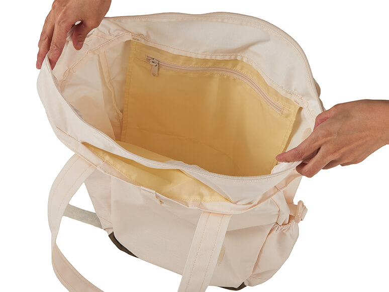 軽量・高耐水素材を採用した多機能トート。大きく開くメイン収納に加え、サイドポケットやジップポケットなど使いやすい収納設計。ショルダーストラップ付きで、肩掛けも背負いも可能。日常からライトなアウトドアまで幅広く活躍します。