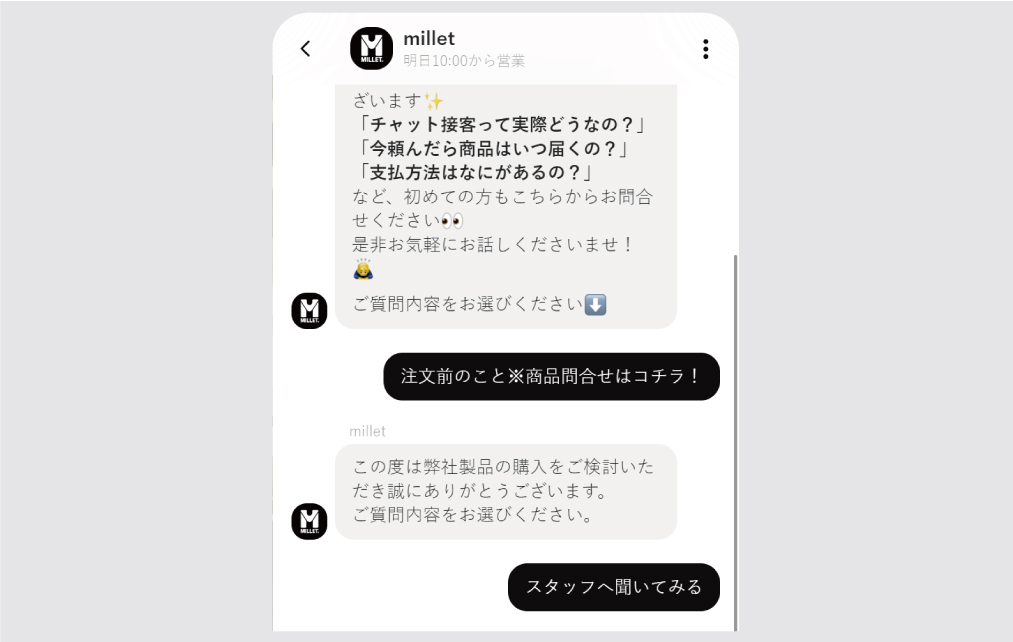 画像のようなお問合せが可能なほか、電話やメールと比較し、商品のサイズや詳細などをよりお気軽にお問い合わせいただける新しい窓口となります。