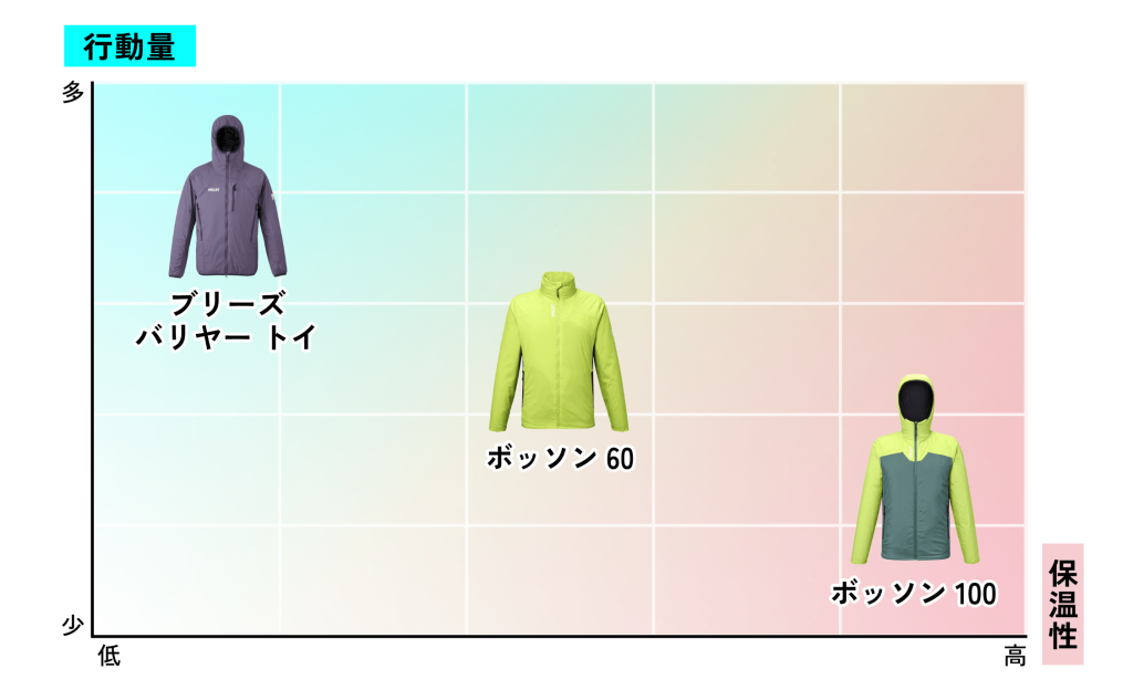 保温性や通気性、吸水速乾性、さらにレイヤリングまで、行動中に求められる多様な状況を想定し、それぞれに必要な機能を追求して開発された3つのアクティブインシュレーション。 シーンやアクティビティに応じて最適な一着を選ぶことができます。